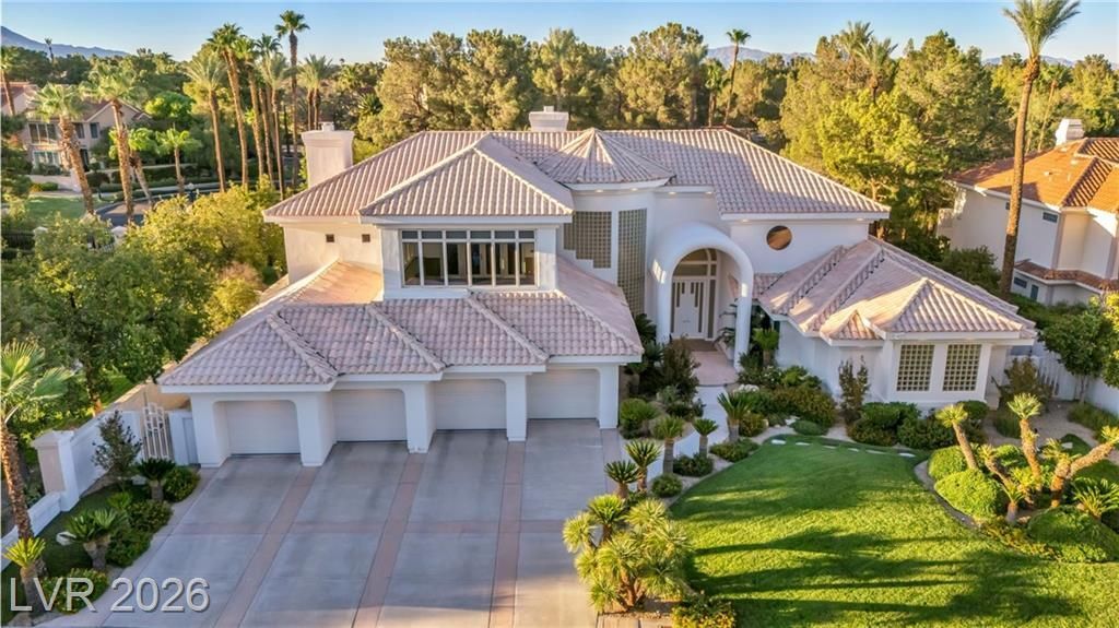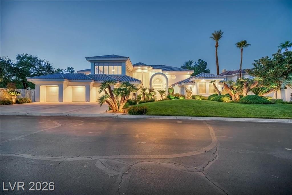 Guard-Gated Entertainer's Paradise & Ultra-Private Oasis | Double-Gated Luxury in Innisbrook Estates at Spanish Trail Step behind the prestigious second gate to this rare Mediterranean estate on a premier south-facing corner lot with 4-car garage. Soaring 24-ft ceilings with cathedral windows frame lush backyard landscaping, a 45-ft pool, and cascading waterfall. Grand living and dining spaces, library, and private aviary. Entertain effortlessly in the family room, media/game room with full bar, and resort-style backyard with spa. Two ensuite bedrooms downstairs; expansive primary suite with fireplace, wet bar, dual baths, steam shower, soaking tub, and dual walk-in closets. Office/loft, workout room, and sun-filled yoga room with sweeping valley views. Prime location in prestigious Spanish Trail with 27-hole golf, minutes from Summerlin and the Las Vegas Strip, offering premier country club lifestyle and unmatched security in one of Las Vegas' most sought-after neighborhooods.