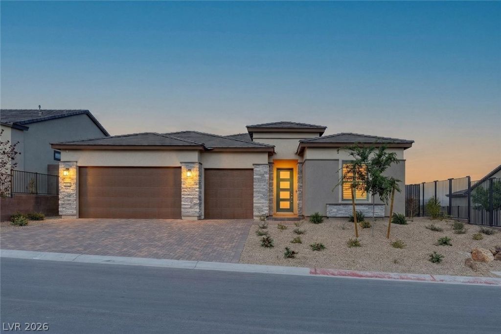 This is it?the largest model with a 3-car garage on a premium lot with fully paid-off solar in guard-gated Trilogy Sunstone, one of Las Vegas's premier 55+ communities. Built in 2025, this 3-bedroom plus den home features an open-concept kitchen, dining, and living area designed for how it lives over time. Upgrades include tile flooring, quartz countertops, upgraded cabinetry, plantation shutters, electric blinds, ceiling fans, and a laundry room with cabinets and sink. After-market upgrades include designer lighting, crown molding, water softener, reverse osmosis, and completed backyard landscaping. Not builder-basic?fully finished and move-in ready. Trilogy Sunstone offers a clubhouse, pool and spa, fitness center, pickleball courts, fire pits, and an active lifestyle in Northwest Las Vegas.