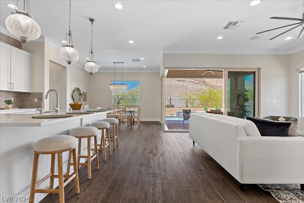 Located in the guard-gated West Summerlin community of Reverence, this single-story home sits on a premium ELEVATED lot with unobstructed VIEWS of Cheyenne Peak. The home backs to a landscaped desert arroyo with no pedestrian access, providing rare backyard privacy. Cornerless retractable glass doors lead to an oasis with built-in speakers, pool, and spa, allowing for a true indoor-outdoor living experience. The gourmet kitchen opens to a spacious great room ideal for entertaining with upgraded tile flooring throughout. A well-designed 3 bedroom floorplan offers excellent separation of space, with the primary suite on one side and two additional guest rooms on the opposite wing, including one with its own ensuite bath, ideal for guests or multi-generational living. Features include tankless water heater, water softener and a 3-zone HVAC with Trane condenser replaced in 2024. Reverence offers trails, resort pools, fitness center, pickleball, clubhouse, and a relaxed outdoor lifestyle.