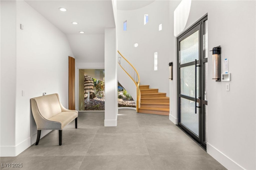 Summerlin Estate in prestigious guard-gated Tournament Hills! At the end of an exclusive cul-de-sac, an architectural marvel underwent a multi-million reno, transforming into midcentury masterpiece. Enter to towering windows w/ sweeping views of a double fairway & mountain ridges. For gourmets, a dream kitchen flows into a great room, and a catering pantry passes to a dining room w/ a 900-bottle wine cellar. Or enjoy the spa wing, w/ yoga studio, steam shower & dry sauna, w/ doors to an infinity-edge pool & spa. The yard?oversized, elevated, & offering privacy?is an entertainer's dream w/ a summer kitchen, fire features & endless vistas. The primary suite boasts a sitting room, breakfast bar, balcony, resort bathroom, and huge custom closet. The home welcomes a family with 3 ensuite bedrooms?and a barndoor-enclosed potential bunkroom at the lower level, which also features a media space and double-sink bath. Additionally, a loft/office has a bar, balcony, & bath?w/ stunning views.