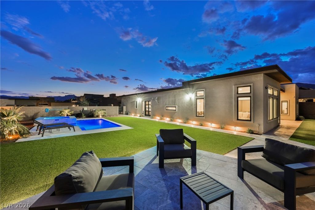 Modern single-story in the highly coveted Overlook Community of Summerlin West! Perched on a 1/3-acre elevated lot, this home offers sweeping mountain views along with partial city and Strip views. The floorplan features 4 spacious bedrooms in separate wings, including a primary suite with stunning mountain views. Designer finishes include a waterfall-edge quartz island, Monogram stainless-steel appliances with wine fridge, tankless water heater, whole-home water conditioner, and a 3-car garage with epoxy floors.The backyard is an entertainer's dream with a travertine-finished pool with automated features and professional landscape lighting. Conveniently located near the Paseo walking trail, top-rated schools, parks, and just minutes from Downtown Summerlin's shopping, dining, and entertainment. Welcome home!