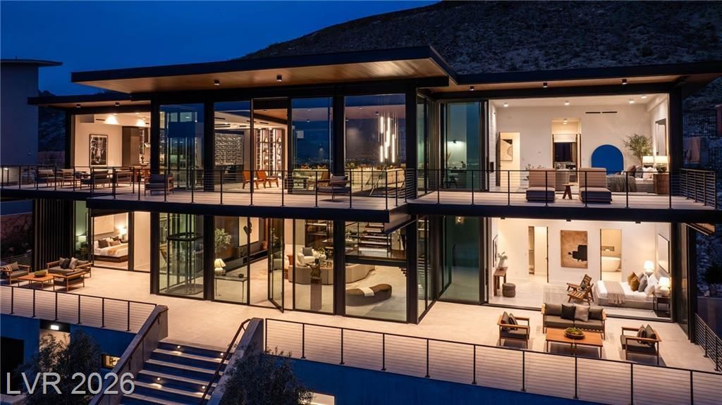 Featuring a one-of-one contemporary masterpiece after years in the making, this residence showcases exceptional construction with steel framing and poured-in-place concrete?materials rarely found in custom builds. The home is adorned with natural stone, DOCA cabinetry from Spain, home automation, and refined architectural details. An expansive floor plan captures Las Vegas Strip views through 12-foot glass, with every room designed for indoor-outdoor living. Energy efficiency is prioritized with a solar system placed to maximize sun exposure while remaining hidden. The main level features a striking kitchen with an integrated dining table, illuminated cabinetry, and wine display. A two-way fireplace opens to a resort-style backyard with lap pool, spa, fire pits, and more. A deep 6-car garage offers flex space for a gym, office, or additional rooms. Within walking distance of DragonRidge Country Club, this home represents the blend of vision, craftsmanship, and intelligent luxury.
