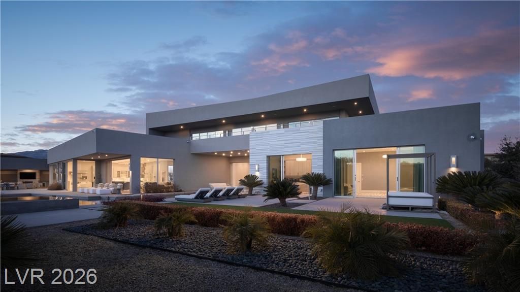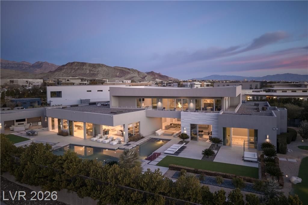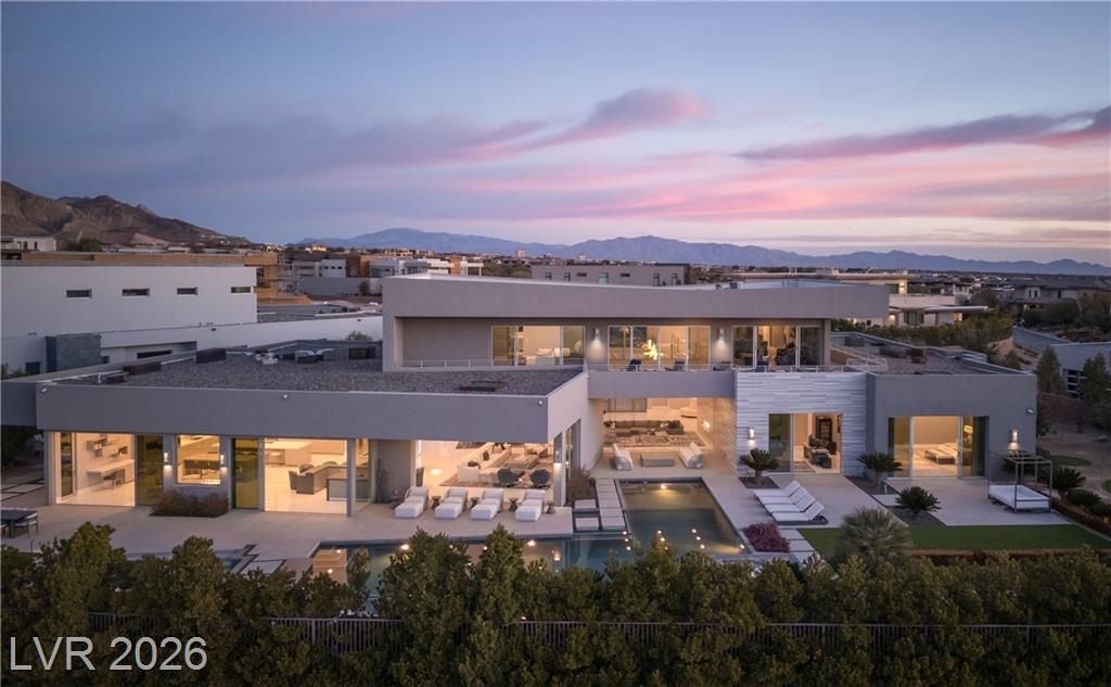 Incredible, modern home in highly desirable Azure neighborhood of The Ridges. Situated on a huge, near-acre lot w/utmost privacy & amazing mountain views, this home has style, finish and build qualities that are second to none. Fantastic floor plan with dual primary suites-one up, one down. Both suites have gorgeous spa-quality baths & spectacular walk-in closets. The chef's dream kitchen is loaded with Wolf & Sub-Zero appliances, double islands, breakfast counter, walk-in pantry. Multiple pocketing doors create ultimate indoor/outdoor vibe and lead to oasis-like backyard. Enormous pool, chic cabana, full outdoor kitchen & putting green transform the yard into the ultimate private resort. Great room features a showcase wine cellar & large bar?perfect for entertaining. Upstairs game room converts into movie theater. Large driveway secured w/powered gate. Oversized secondary bedrooms have en suite bath & walk-in closets. Separate office. Recently updated whole-home Crestron A/V system.