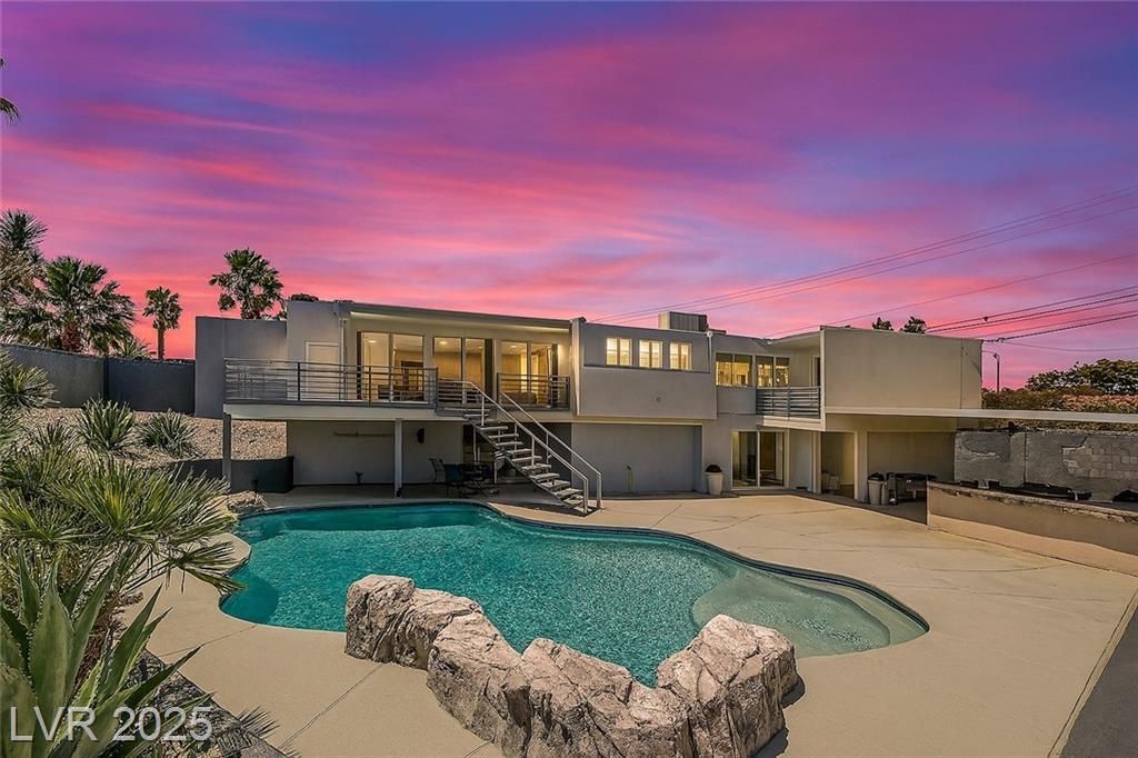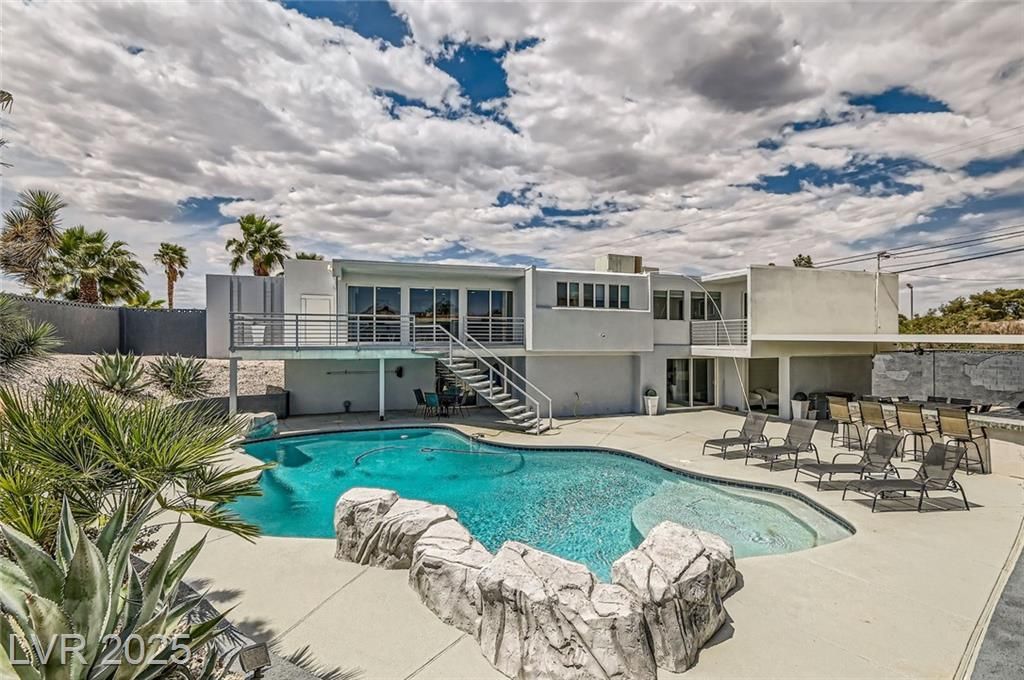 CUSTOM 2-STORY ENTERTAINER'S DREAM ON NEARLY ½ ACRE LOT WITH NO HOA?KNOWN AS OLD VEGAS' FAMOUS 'ELVIS HOUSE! 4 BED, 4 BATH + DEN, FULLY FENCED WITH MASSIVE DRIVEWAY, SPARKLING POOL, COVERED PATIO, BUILT-IN BBQ, RV PARKING, AND NO REAR NEIGHBORS! RECENTLY REMODELED TO A GORGEOUS MODERN DESIGN. FORMAL LIVING ROOM HAS WOOD-BURNING FIREPLACE. GOURMET KITCHEN FEATURES STAINLESS STEEL APPLIANCES, BUILT-IN MICROWAVE, QUARTZ COUNTERS, BREAKFAST BAR, AND GARDEN WINDOW. OPEN CONCEPT LAYOUT WITH GAME ROOM/FAMILY ROOM AND ENCLOSED SUNROOM. HUGE PRIMARY SUITE INCLUDES BALCONY, 2 SINKS, SEPARATE TUB & SHOWER, AND WALK-IN CLOSET. DOWNSTAIRS BEDROOM NEXT TO ¾ BATH?PERFECT FOR GUESTS OR MULTI-GENERATIONAL LIVING! WOOD TILE, LAMINATE, AND TILE FLOORS THROUGHOUT?NO CARPET FOR LOW MAINTENANCE. 2-CAR GARAGE WITH BUILT-IN CABINETS AND WATER SOFTENER. TOTAL SQFT 3,526. CONVENIENTLY LOCATED NEAR SHOPPING, DINING, ENTERTAINMENT, AND FREEWAY ACCESS!