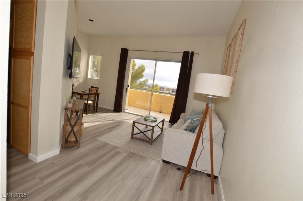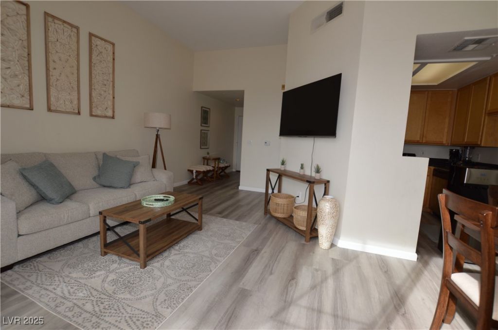 Top-floor, fully furnished penthouse condo with partial city and Strip views, just minutes from the Las Vegas Strip. This upgraded unit features luxury vinyl flooring throughout, granite countertops, stainless steel appliances, and an in-unit washer/dryer. Enjoy the patio overlooking the city. This community features resort-style amenities within this lush 16-acre gated community, including two pools (main pool heated in winter), spa, fitness center, sauna, and courts for tennis, pickle-ball, and racquetball. Multiple cobblestone walkways throughout the community for evening strolls, poolside cabanas and BBQ areas around each of the pools. With 24-hour access to most amenities and a prime location only 1.5 blocks from the Strip, this condo is located in a prime location, offering comfort and convenience.