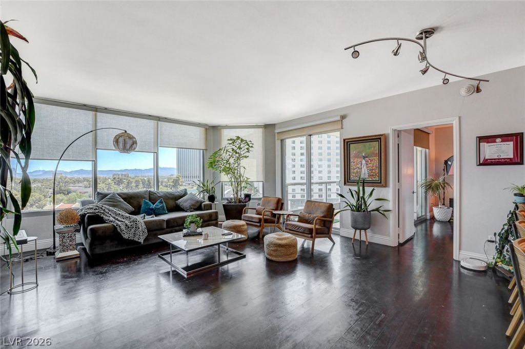 Stunning High-Rise Residence with Unmatched Views at Turnberry Towers Experience luxury living in this gorgeous 2-bedroom, 2-bath B floorplan at the prestigious Turnberry Towers. This highly sought-after layout offers a through-unit design, showcasing panoramic views of the Las Vegas Strip, mountains, golf course, and resort-style pool from both sides. Elegant dark hardwood floors flow throughout the main living areas, complemented by marble bathrooms, granite countertops, and custom solar shades. The spacious kitchen features high-end finishes and bar seating, perfect for entertaining. Both bedrooms include large, custom-built closet systems, offering exceptional storage and style. Enjoy full-service amenities, 24-hour security, valet, concierge, fitness center, tennis courts, and a lagoon-style pool. This move-in ready home offers the ultimate high-rise lifestyle just steps from the best of Las Vegas.