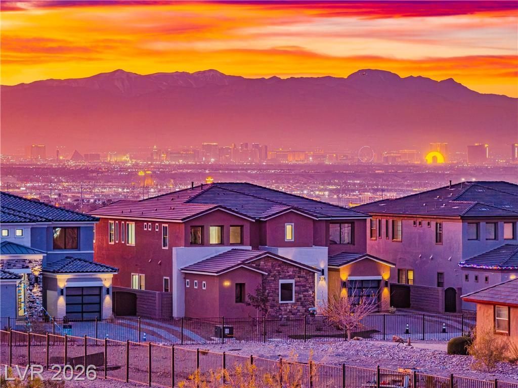 SELF-GUIDED NO AGENT required to tour on YOUR schedule (QR code in pics). A community of Executive-Style NEW HOMES with clear site lines to the Las Vegas Strip. This two-story home offers mountain & strip views, 5035sf, 5 ensuite bedrooms w/walk-in closets, 4-car garage parking, RV PARKING+hook-ups, 10+ ceilings, massive laundry w/island, Super Loft w/deck, soft-close cabinets w/under cabinet lighting, quartz counters, luxury flooring finishes, matte black fixtures, wet bars, linear fireplace, oversized patio/deck, & a pool-sized yard. Kitchen includes nook & butler area with walk-in Pantry and space for additional fridge, Bertazzoni Master Series stainless appliances: 48 slide-in range/oven with hood, refrigerator + freezer columns, 2 dishwashers, microwave & warming oven. Primary Bedroom has an oversized walk-ins w/laundry, wet bar & spa-like bathroom. Neighbors: Heritage Park, Aquatic Center, Senior Facility, & the nearby amenities of the Water Street District.