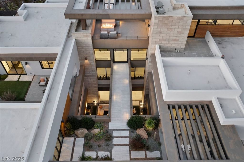 Architecturally significant & masterfully built by Blue Heron, over 4 levels this 10,000+ sqft modern estate rests on a 1-acre homesite, delivering unmatched privacy & panoramic views within the guard-gated community of The Ridges in Summerlin. Upon entry, grand living spaces unfold beneath soaring architectural lines, seamlessly integrating with the home's open-concept design. The residence offers 6 generous suites, detached casita, fitness studio, executive office & a state-of-the-art theater - each space thoughtfully curated with elevated design and intention. The primary offers ample closet space & a showstopping outdoor shower. Outdoors, the resort-caliber grounds serve as a private retreat with two saltwater pools, spa, fire feature, grilling lounge & cascading waterfalls that flows to a lower-level koi pond - an extraordinary setting for refined living, serenity & unforgettable entertaining. The lower level is refined for entertaining with in/outdoor theatre, bar & wine room.