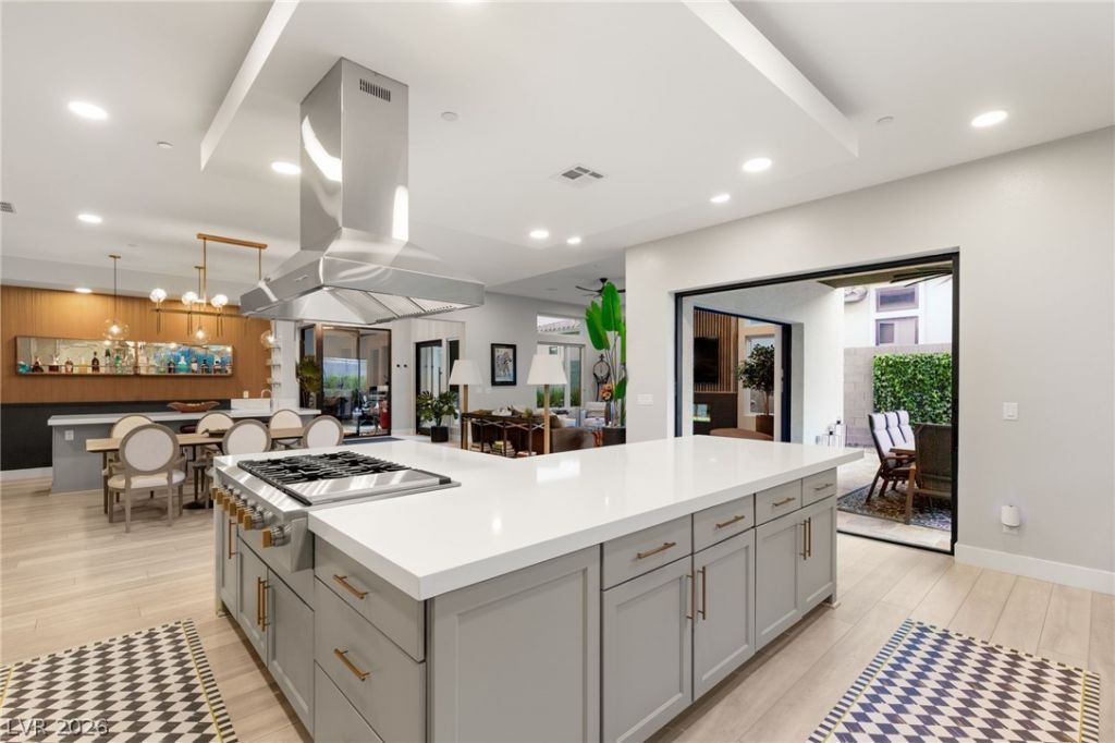 Experience modern desert elegance in this stunning Summerlin residence, designed with custom landscaping and a private gated courtyard entrance. Step through a dramatic glass pivot door into soaring 12' ceilings illuminated by an RH chandeliers. The great room impresses with a sleek entertainment wall, fireplace, and dual pocket sliders opening to a resort-style backyard. A chef's kitchen boasts of Monogram appliances, built-in fridge, farm sink, double-stack cabinets, and custom pantry. Entertain in style with a sophisticated dining area, bar, and Sonos sound system. Primary suite offers backyard access, spa-like bath with soaking tub, oversized shower, and boutique-style custom closet. Both guest rooms are complete with attached full bath and walk-in custom closet. Outdoor living features travertine decking, heated lap pool with water feature, loggia with fans. Glass-enclosed office, tinted windows and advanced security. 50,000 of owned solar panels complete this remarkable home.