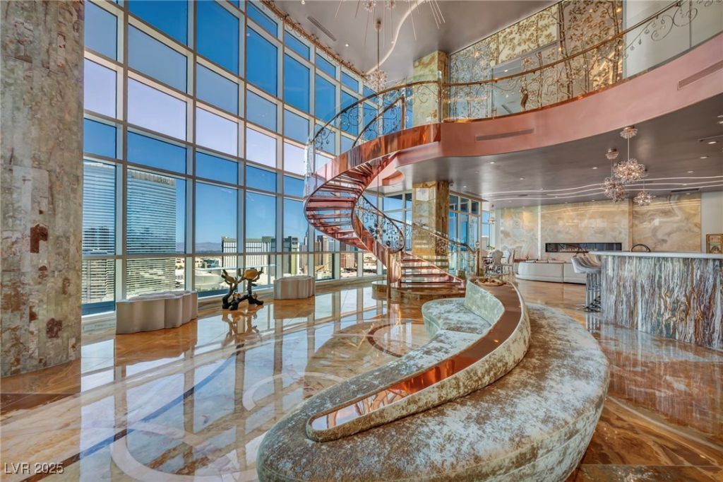 Rising above Dean Martin Drive, the Panorama Towers unit showcases sophisticated artistic expression and incredible Strip views. A rare, three-level, custom-designed residence features 8,017 square feet of living space, boasting architectural detailing and extraordinary finishes. It features a 1,000-square-foot lower-level guest quarters, a hand-painted dance floor, a Swarovski Rose chandelier, a pneumatic vacuum elevator, marble flooring, a stunning staircase, and a wrap-around Sky Deck. Its spectacular kitchen is graced with black marble countertops, professional-grade Wolf appliances, copper sinks, and an elevated bar with seating that wraps around the space. The upper-level primary suite features a custom art wall, a separate seating area, and an opulent bath, complete with dual vanities, an elevated tub, and a shower. The suite features two high-tech showers. Panorama Tower features luxurious amenities, including a fitness center, a his & her spa, and 24/7 security.