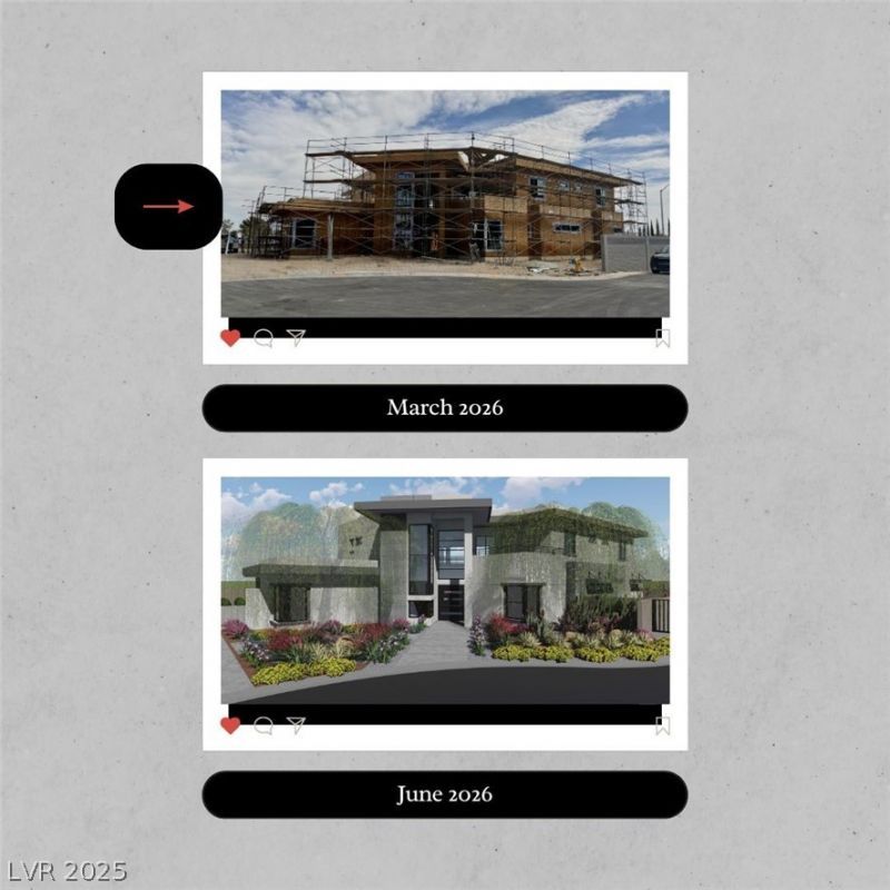 Nestled in a cul-de-sac and positioned northwest, the home captures views of Lone Mountain and the Las Vegas skyline and is an entertainer's dream. A grand entry with a soaring 28'8 ceiling opens to a stunning great room with panoramic sliders overlooking a modern pool and cascading waterfall. The home features a dual-loft design: a north loft with seating overlooking the great room, and a private south loft with an accent wall, wet bar, and direct access to a spacious patio. The south loft connects to two upstairs bedroom suites, creating a secluded retreat. Additional highlights include a home office, theater room, gym/sauna, pool & spa, and a 4-car garage on a 25,031 sq. ft. lot. The luxurious primary suite offers a lounge, spa-inspired bath with three-head shower, dual water closets, extended walk-in closet, washroom, safe room, and direct access to the outdoor hot tub. *Flooring and fixtures have been pre-selected. Furniture not included; renderings are virtually staged.*