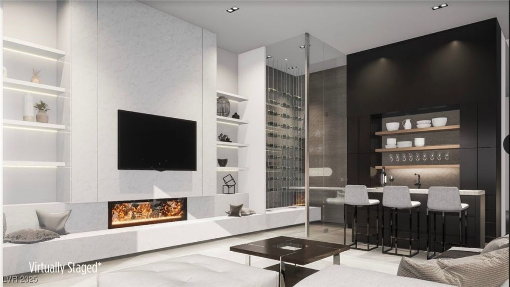 GORGEOUS CONTEMPORARY CUSTOM HOME FEATURING CITY/STRIP & MTN VIEWS, HUGE GLASS PIVOT DOOR,EST. 7000 SQFT LIV SPACE, 5BED, 8 BATHS, FRONT SECURITY GATED ENT, DETACHED DBL RV GARAGE (CLIMATE CONTROLLED), DESERT LANDSCAPE WITH AUTO DRIP SYS, IN GRND POOL/SPA, FIRE PIT, OUTDOOR KITCHEN, BUILT-IN BARBECUE, CVRD BALCNY, CVRD PATIO. 4 GAS FIREPLACES, 2 WET BARS, 2 LNDRY ROOMS, MUD ROOM, FOYER, STAINLESS STEEL STAIRCASE RAILING, PANTRY,TOP OF THE LINE KITCHEN APPLIANCES & CABINETRY, DBL OVEN, BUILT-IN MICROWAVE, GRANITE KITCHEN COUNTERS, BACKSPLASH & CULINARY ISLAND, CEILING FANS, RAISED PANEL DOORS, UPGRADE BATHROOM FIXTURES AND FAUCETS, GRANITE BATHROOM VANITY COUNTERS, PORCELAIN TILE BATHROOM SHOWER WAINSCOT WITH DESIGN, OVERSIZE CLOSETS, DUAL SINKS, FLOATING CABINETS, SEP PORCELAIN TILED SHWRS AND ROMAN TUBS IN MAIN BATHROOMS, WINE ROOM, SAFE ROOM, FINISHED 4 CAR GARAGE, ROOFTOP DECK W/PATIO/FIREPIT/BATHROOM/JACUZZI & BBQ AREA. EST COMPLETION DATE APRIL 2025. PHOTO OF HOME IS A RENDERING.