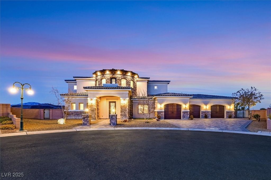 Stunning custom luxury estate boasts 4 bedrooms 6 bathrooms and 6,398 square feet! This one of a kind custom home on huge half acre lot features breathtaking unobstructed Las Vegas Strip and mountain views from all over the property! Indulge in the gourmet kitchen offering top of the line built-in stainless steel GE Monogram appliances, double ovens, 6 burner stovetop, butlers pantry, and an oversized island with ample bar seating! Dual master suites on first floor, plus two offices/flex rooms! Every bedroom with en-suite private bathroom, accompanied by walk in custom closets! Huge loft makes for the ideal game room equipped pool table and shuffle board! Relax in this resort style backyard featuring a pebble tech pool with waterfall, covered patio and massive second story balcony! Oversized garage of nearly 1,500 square feet can store up to 6 cars! Located in a quiet gated community!