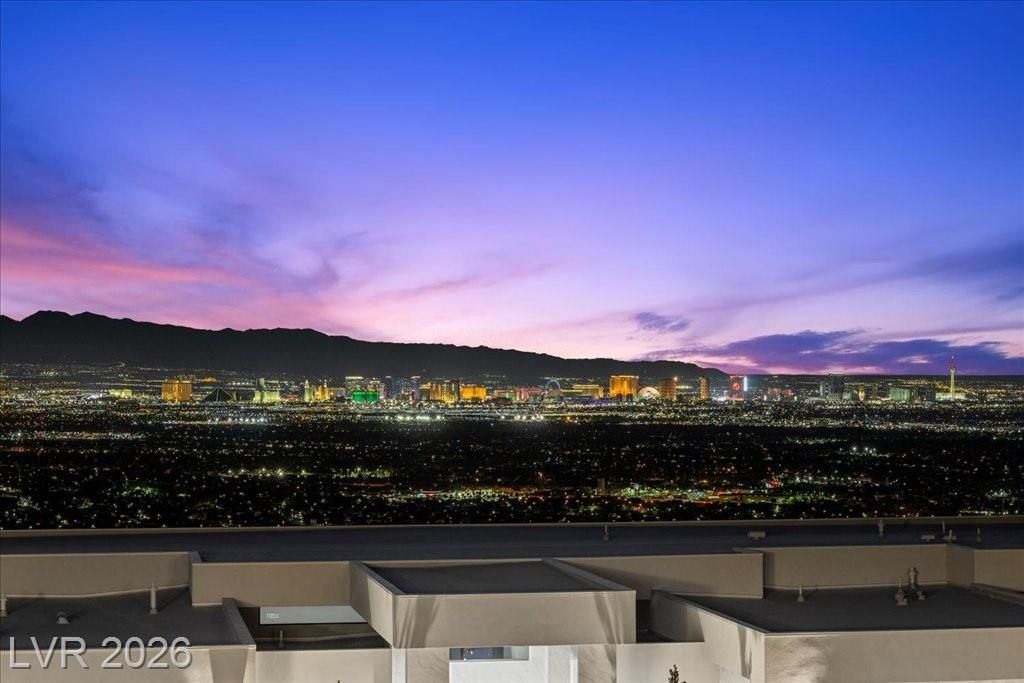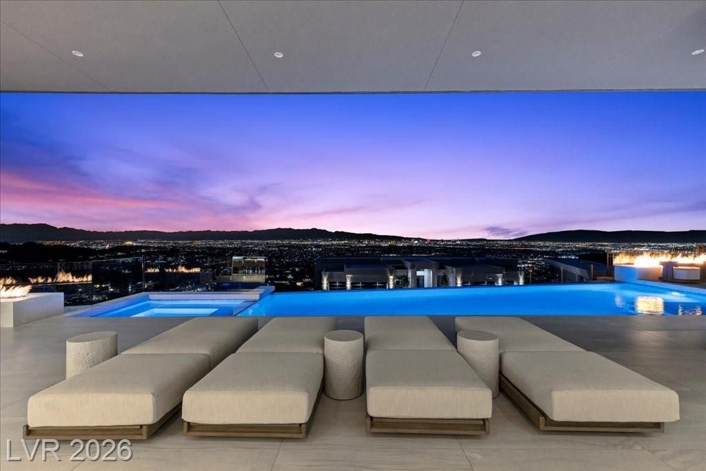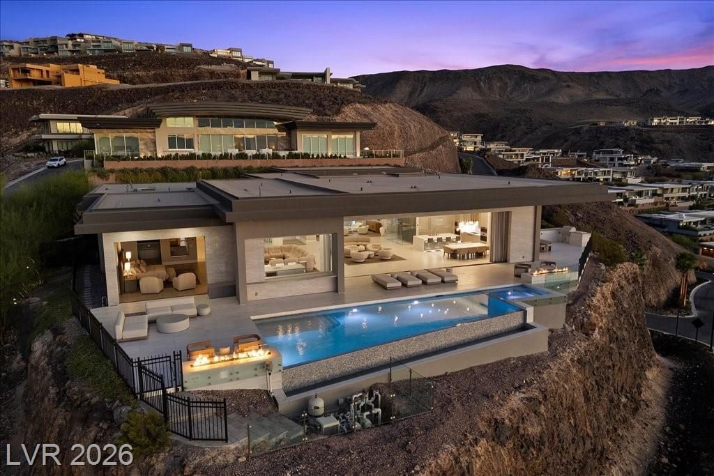The Cliff House is a true single-story modern masterpiece by renowned architect Richard Luke, AIA, positioned on one of the most coveted pointe locations in MacDonald Highlands with a private drive and breathtaking Strip, golf course, city, and mountain views. Situated on nearly half an acre, this 6,099 SF custom estate offers 4 ensuite bedrooms plus an office, 5 baths, and a rare 6-car RV-height garage. Every room features expansive glass pocket doors for seamless indoor-outdoor living and panoramic vistas. Recently enhanced with premium European oak flooring and intelligent Lutron lighting, the home showcases soaring 14-ft ceilings, linear fireplaces, and a chef's kitchen with Wolf and Sub-Zero appliances, quartz waterfall counters, and glass wine cellar. The spa-inspired primary suite opens to an infinity-edge pool, spa, and dual fire lounges. A rare architectural statement combining privacy and luxury, plus Nevada's no state income tax advantage for individual or corporate income.