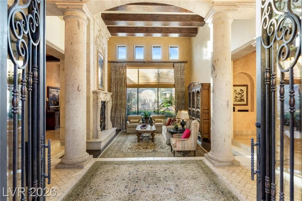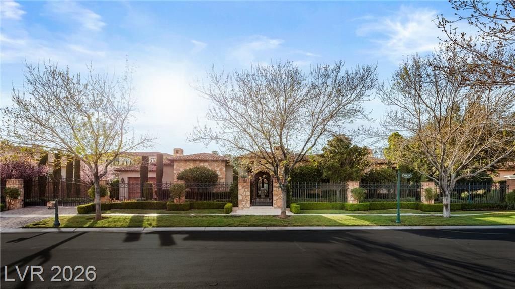 Discover this exceptional custom single-story Tuscan estate in the prestigious gated enclave of Vintage Valley within guard-gated Southern Highlands. Designed for both comfort and entertaining, the home features a spacious open layout with formal living and dining rooms, soaring ceilings, and a grand great room with beam details, built-ins, wet bar, and a gourmet kitchen with oversized island and professional appliances. Two private offices and a dedicated movie theatre add flexibility and function. The expansive primary suite is a true retreat, complete with a sitting area, two-way fireplace, spa-inspired bath, and private spa room with in-ground Jacuzzi. Pocket doors create seamless indoor-outdoor living, opening to a resort-style backyard with lush landscaping, multiple seating areas, a beach-entry pool with waterfalls, spa, and grotto. Fully privately gated with a 4-car garage, this home offers privacy, elegance, and the ultimate Southern Highlands lifestyle.