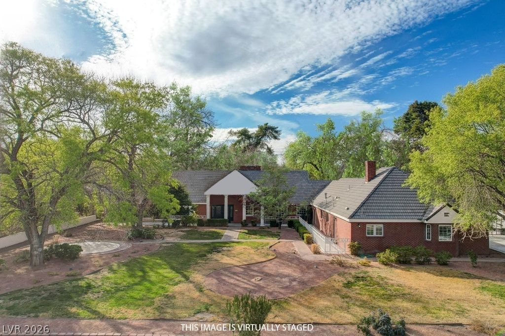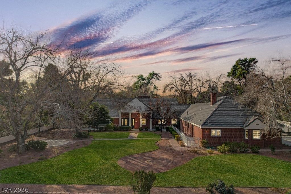 Located in the guard-gated equestrian community of Sierra Vista Ranchos, 7229 Mira Vista is a rare traditional brick estate set on 0.88 of an acre. The main home offers 4 bedrooms plus a den and 4 full bathrooms, including a downstairs primary suite designed as a private retreat. The primary bath features a steam shower and jacuzzi soaking tub. Multiple fireplaces add warmth and architectural character throughout. The kitchen is equipped with premium Sub-Zero and Wolf appliances, blending performance with elevated design. The attached additional 1,401 square foot casita includes 1 bedroom, 1.5 bathrooms, full kitchen, private laundry, and two separate entrances. Outdoors, enjoy a resort-style pool, mature trees, expansive grounds, and a private electronic gate. Generous living and dining spaces create seamless flow for entertaining, while the oversized lot offers privacy and flexibility rarely found in central Las Vegas.