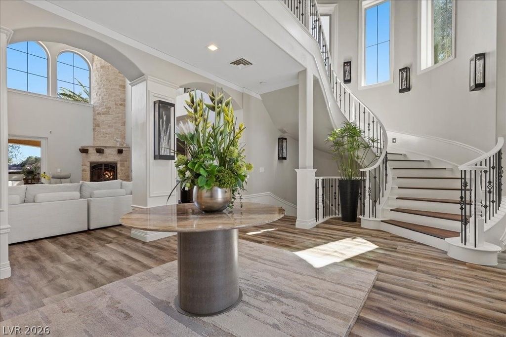 Extraordinary custom estate located in a gated cul-de-sac designed for exceptional entertaining & everyday living. The dramatic great room features soaring cathedral ceilings with custom wood beams, limestone fireplace, and expansive glass sliding doors that open to the backyard for seamless indoor/outdoor living. A spectacular 12-foot-deep lagoon pool with grotto, slide, diving board, waterfalls, lush landscaping and private putting green. Gourmet kitchen offers SS appliances, quartz countertops, breakfast bars with built in seating, spacious dining area and walk-in pantry. The home features a luxurious primary suite, spacious guest rooms, detached casita, fitness room, and pool house with full kitchen & bath. The finished basement includes a game room, full bar, movie theater, and dedicated golf simulator room. Travertine and real wood flooring, custom lighting, Control4 home automation, 4 car garage with epoxy flooring, & 2,000 SQ FT detached RV garage that doubles as a sport court.