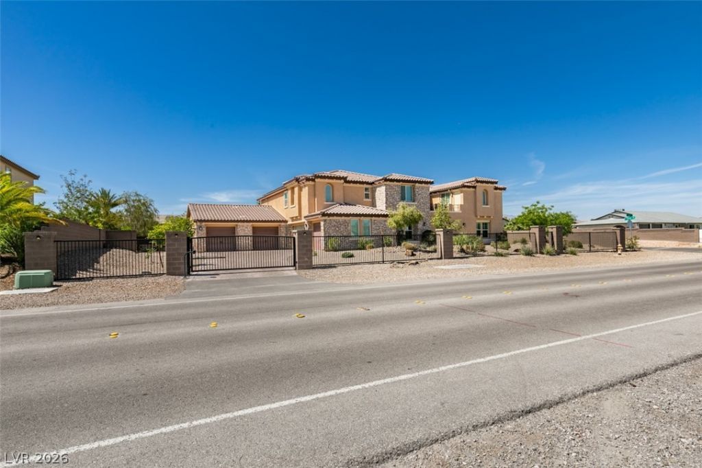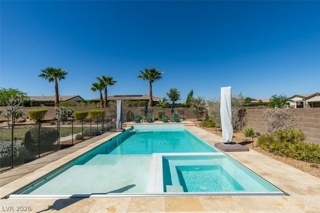 Rare and truly unique 7-bedroom, 6,117 sq ft estate with a 6-car garage on a ½-acre corner lot in Southwest Las Vegas?no HOA. Designed for flexibility and multigenerational living, this expansive home features dual laundry rooms, a loft with separate entrance and kitchenette, and two main-level bedrooms. The chef's kitchen offers quartz countertops, a large walk-in pantry, premium built-in Thermador appliances, and a breakfast area, flowing into the family room with fireplace. Formal dining room, separate living room, and multiple gathering spaces provide ideal functionality and scale. The primary suite includes a private balcony, spa-style bath with dual water closets, separate tub, walk-in shower, and a custom closet connected to the upstairs laundry. Resort-style backyard with covered patio, heated pool, spa, and fire pit. Private gated entry, paid-off solar, custom security shutters, and exterior lighting complete this exceptional offering.