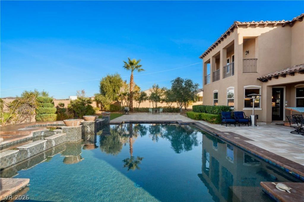 Beautifully reimagined inside the gated community of Lake Mead Estates, this home blends warmth, comfort, and modern luxury on nearly an acre. Fresh interior and exterior paint, new porcelain tile floors, new carpet, and custom media walls elevate every space. The kitchen features quartz countertops and a large quartz island, opening to a newly added multi-panel doorway that creates seamless indoor?outdoor living. The resort-style yard offers a refinished pool, new travertine, real grass, and mountain/Strip views. Every bedroom includes its own bathroom and walk-in closet, providing exceptional comfort and privacy. Complete with six bedrooms, eight baths, a wine cellar, gym, and inviting balconies, this home delivers thoughtful design and everyday livability.